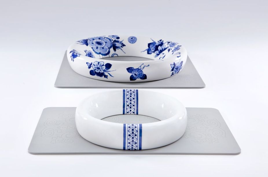 The collection, called D1653 after the year in which the company was established, combines the traditional decorative paint practice with modern Dutch design. Pieces include a series of ceramic bottles with decorative blue collars, designed by Arian Brekveld, and the Double Heritage decorative vessels by Damian O’Sullivan.