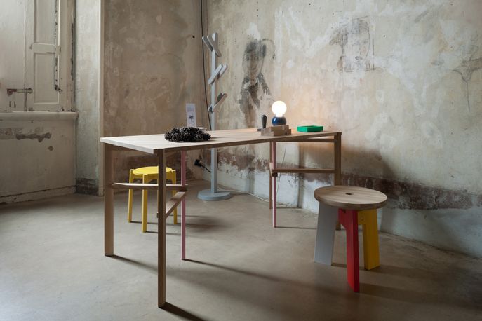 The collection comprises refined fun and functional furniture made from offcut hardwoods such as Japanese oak and maple, including the Soft Triangle low table by TAF in muted mint green and the Berra desk card stand from ECAL’s Lucien Gumy.