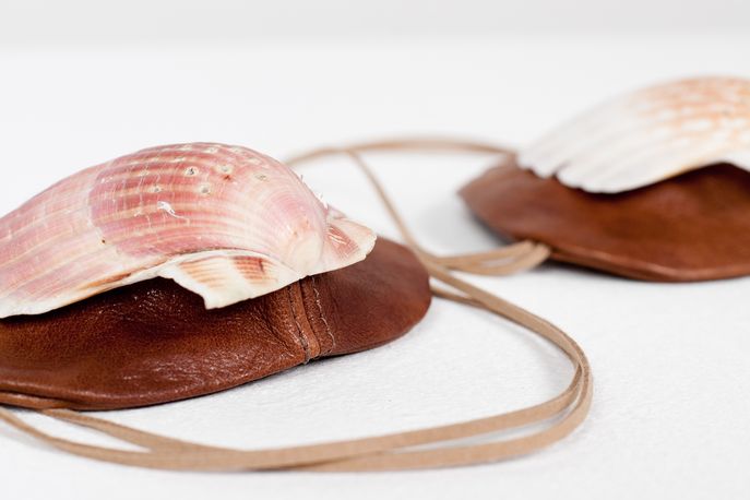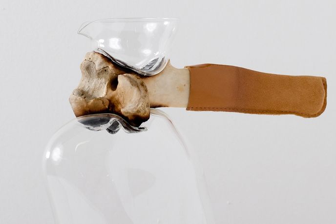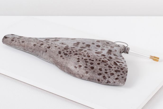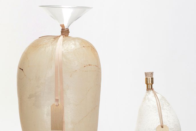 The collection includes vessels made from bulbous blown cow bladders and a series of water bags featuring the thick colourful skins from perch and wolffish.