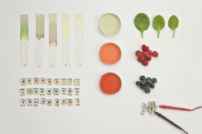 Each piece of glassware contains dye-sensitised solar cells that produce electricity by converting energy from light absorbed by the dye.
