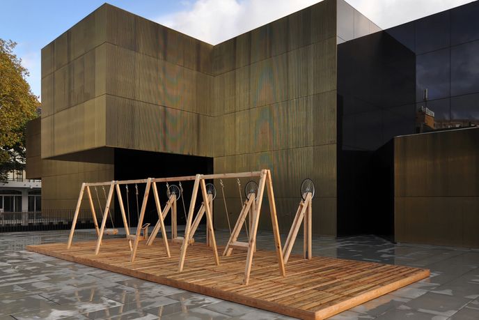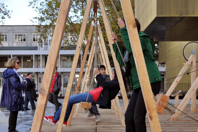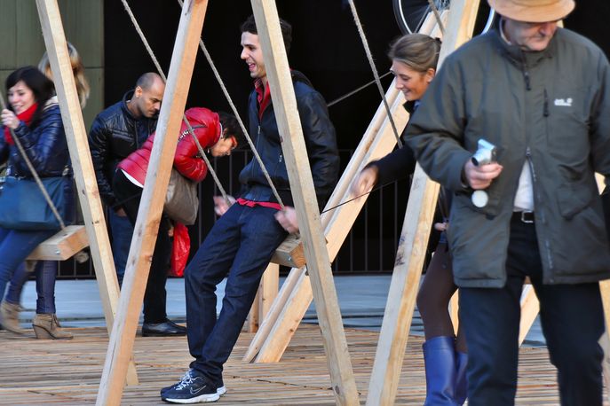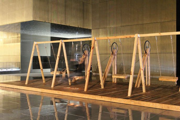 The installation harnesses the energy produced on a swing to generate electricity. A simple wooden framework made of re-usable wooden pallets conceals a hidden electrical system. A contraption of ropes, wheels and bicycle chains turns a dynamo that powers a light.