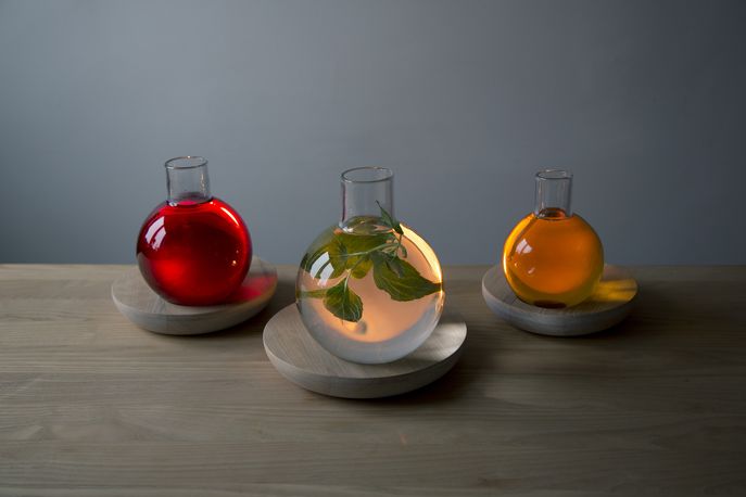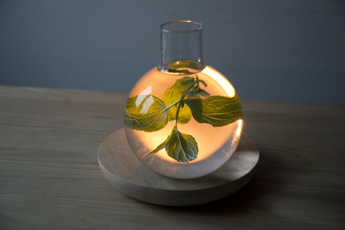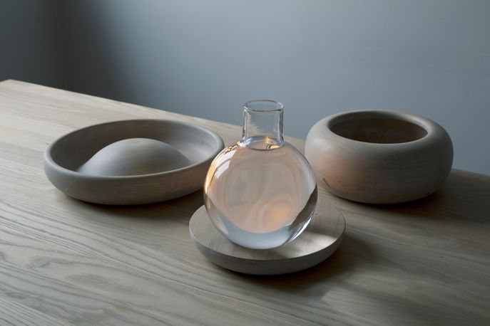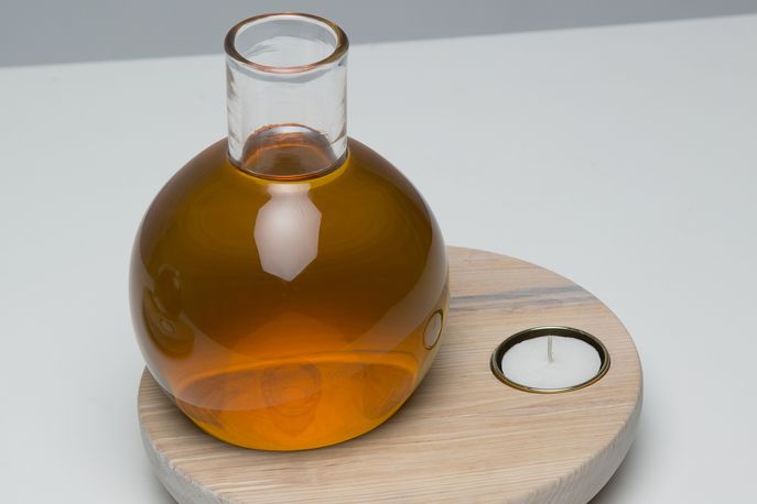 The Liquid Light piece from the collection stands out. It is a plate made of birch wood that holds a glass carafe and a socket for a candle. The glass orb works as a lens to increase and spread the light from the flame, turning it into a lamp.