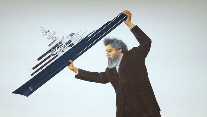 English Magic is a series of works by British artist Jeremy Deller. One piece is a giant mural in which William Morris – leading member of the Arts and Craft movement – has picked up the super yacht of Russian oligarch Roman Abramovich and is poised to plunge it into the sea.