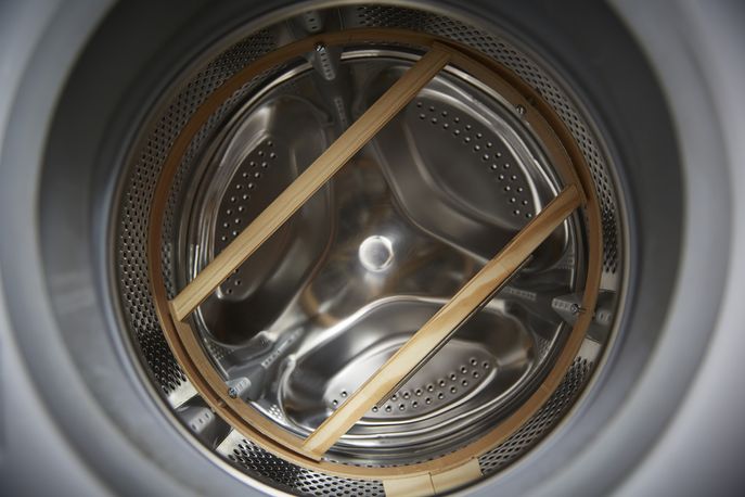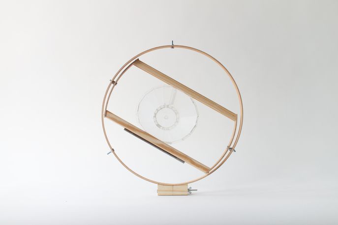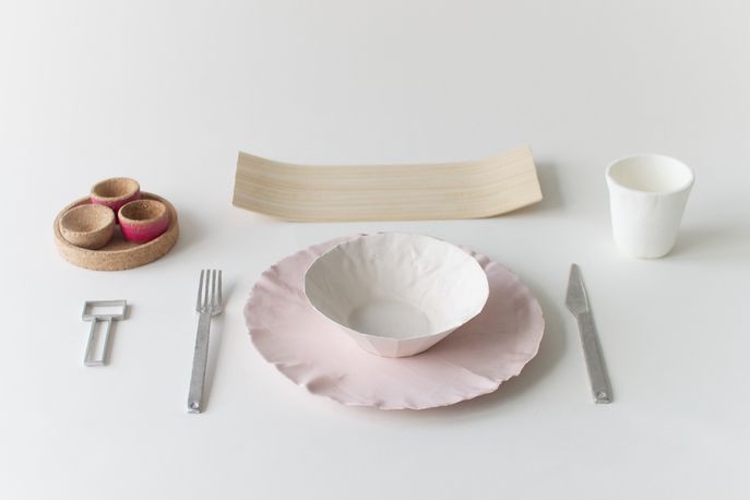 The objects in the collection include a wooden framework that fits inside a washing machine to facilitate rotational casting of ceramic tableware when the washing machine is in use. Steiner also produced pieces that facilitate steam bending using a microwave and brake pressing using a door. The results of the mini-home factory are delicate cutlery and plates with a rough and raw finish.