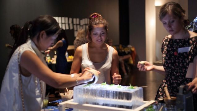 The three stages of making a cocktail – putting ice in the glass, adding the liquor and finishing with a garnish – were re-interpreted through ice sculpture. Participants were shown how to chisel ice, drip juices through drilled holes in ice blocks, and freeze caramel lollipops as garnishes and edible stirrers.