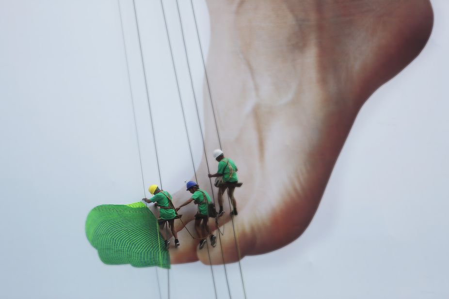 Shanghai – To promote the global launch of its new shoe, made through an innovative Flyknit construction technique, Nike China hoisted three men above an advertising hoarding to seemingly knit a billboard-size version of the shoe for the whole city to see.