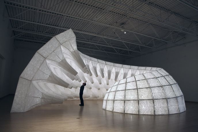 The Capacitor sculpture, installed at the Kohler Arts Center in Sheboygan, receives data from the roof of the Kohler Arts Center to function. It acts according to the current wind intensity and temperature, and changes its level of light and movement in response. Shifts in wind result in the sculpture either contracting or releasing, giving a visual and visceral experience of the weather, indoors.