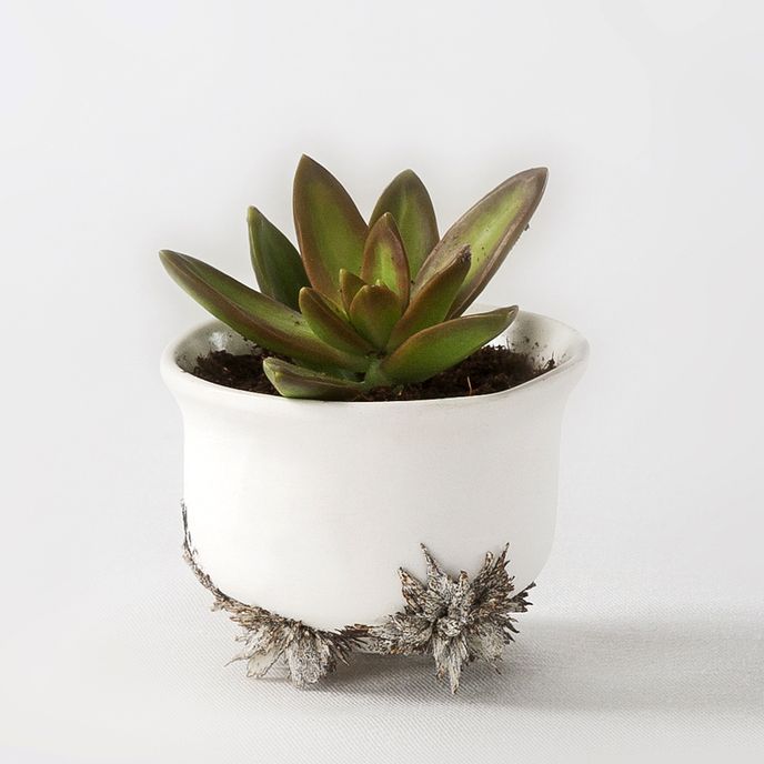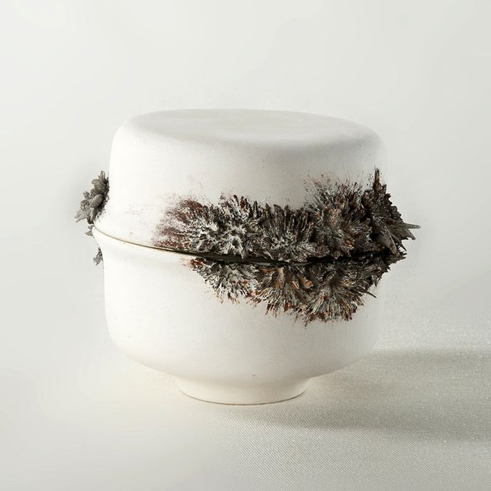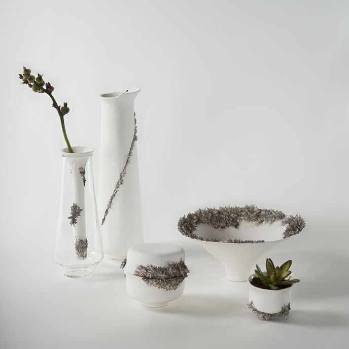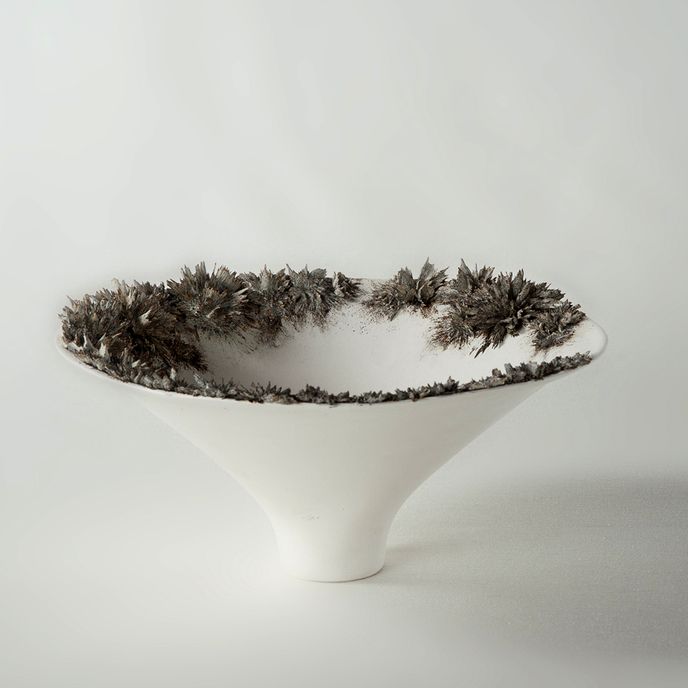 CeraMetal is a blend of metal powders and ceramics, which Kirschner used to create bowls and receptacles that have an organic, disruptive feel. The designer mixed ceramic material with two metals, with different effects. She mixed some with iron powder and then used magnets to create the sharp organic shapes that emerge. She also melted copper to give the ceramics an eroded appearance.