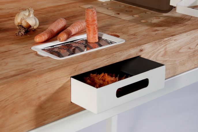The ChopChop workspace is made of a wooden counter top and steel frame with adjustable tubes that allow the counter to sit at whatever height is comfortable for the cook. Considering the mobility difficulties of older people, Biotto moved traditional kitchen storage – which is normally on high shelves or in low cabinets – onto the worktop, creating perforations on the splash panelling for easy hanging of pots and pans, and a storage area on hand. The worktop also has an embedded grater – making grating a much easier task than using the awkwardly shaped grip of most commercial graters – and an extendable hose that makes filling vessels from the sink a much simpler task.