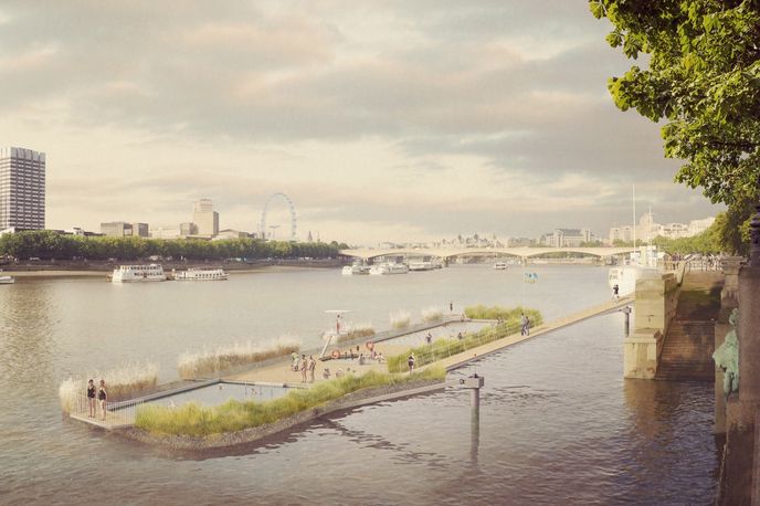 The showcase will include two UK schemes, one for a set of permanent London river bathing stations, and another for a temporary pool on the King’s Cross development site. Both will use river water that is purified through a natural process using wetland plants.