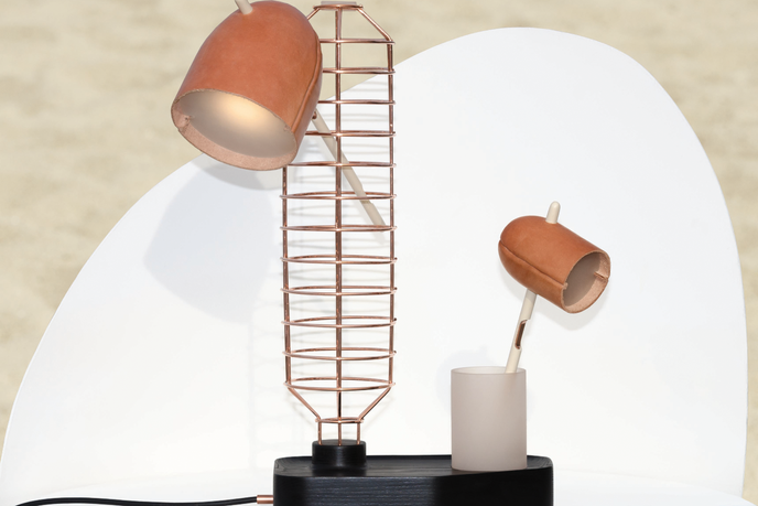 The lamp, which consists of two separate free-standing lights, does not have an on-off switch, but sits in a copper frame when turned on, and in a vase when off. The user can choose a low, intimate light or a large, beaming flood of light, and the lamp can be placed at different angles.