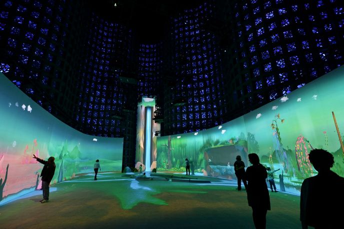 Connected Worlds is an immersive installation consisting of six interactive eco-systems projected onto the floors and walls of the New York Hall of Science. Visitors can interact with the digital projections using physical objects, which have a direct effect on the virtual space.