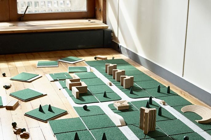 The resulting collection includes paperweights, crockery, bedding, mirrors, toy building blocks and storage containers designed for life inside the restored 1950s building. A rechargeable desk lamp by Stanislaw Czarnocki, for example, doubles as a spotlight for the building’s communal roof, while square cushions by Roosa Ryhänen can be linked together to create a seating area.
