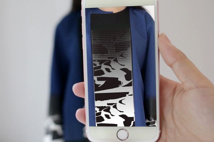 When a smartphone is pointed at the clothes, the screen-printed patterns activate the app into playing a programmed set of digital additions, which appear to form part of the garments themselves.