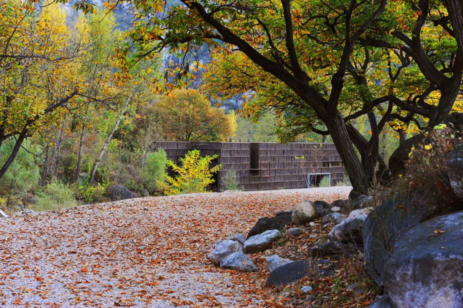 The library is made from locally sourced firewood, similar to that used by villagers to light their stoves. The building is defined by its location in the mountains, and was designed as a serene place of contemplation.