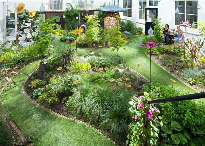 The Fairy Tale garden contains edible flowers and is designed to attract birds and butterflies. Created by French duo Claude Pasquer and Corinne Détroyat, it features oversized mushroom and flower sculptures to bring a fantastical aspect to the central courtyard.