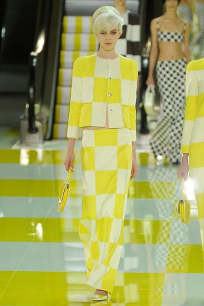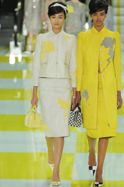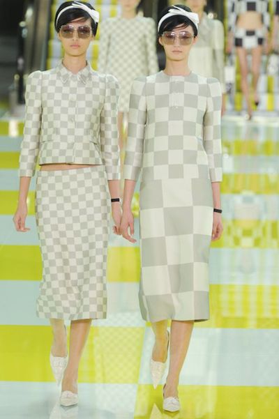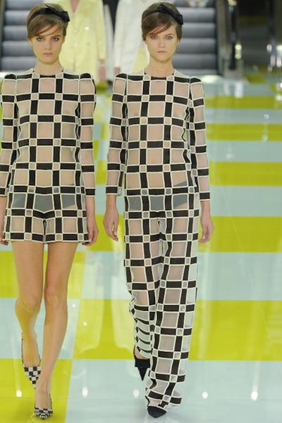 Marc Jacobs unveiled Louis Vuitton’s spring/summer 2013 show in Paris this week, incorporating a string of graphic looks, including chequerboard print minis and crop tops, mini-shift dresses and swing coats. The look was highlighted with 60s beauty, including teased chignons and heavy cat eyeliner.
