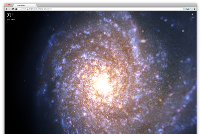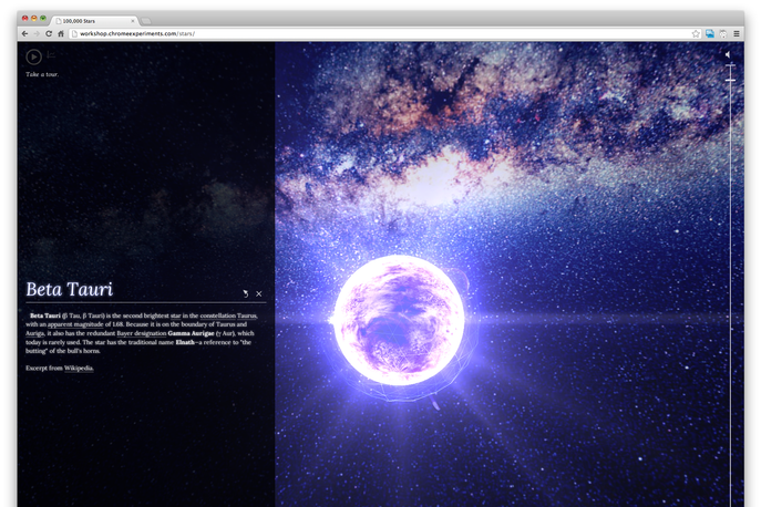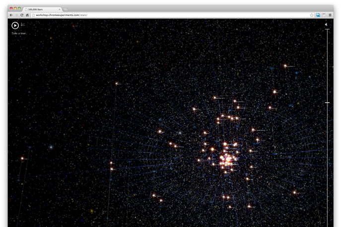 The 100,000 Stars project is hosted on the Chrome Experiments website, which invites programmers to share innovative designs. It uses data from Yale University, the European Space Agency and other sources to plot the location and temperature of nearly 120,000 stars. Users can manipulate the field in three dimensions, while zooming in for close-ups of 87 stars paired with data from Wikipedia.