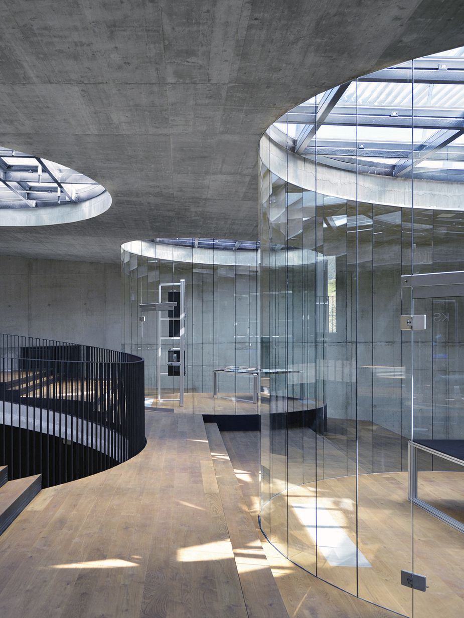 The architects designed a concrete structure composed of two cylinders that suggest rotation and the idea of artificial gravity. The curved concrete walls and cylindrical glass display areas suggest a spacecraft from science fiction, while the apex of the structure is devoted to researchers on the history of space technology.