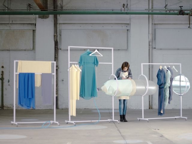 A prototype was first shown at Dutch Design Week last year, but the collection on display in Milan is a more developed version. The pieces are now ready to wear, with the first layer no longer transparent and designed to fit closely to the body. Sleeves and collars have also been added, creating a more professional and wearable look. The garments are washable, making them practical for everyday use.