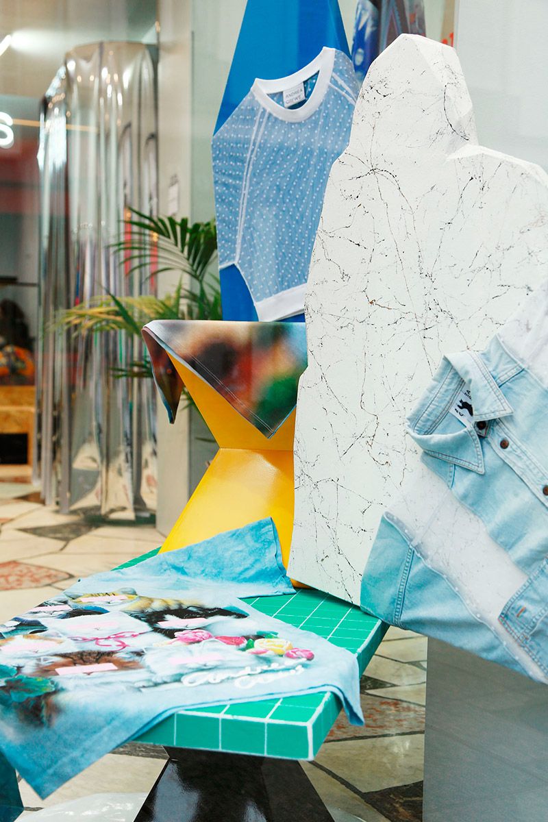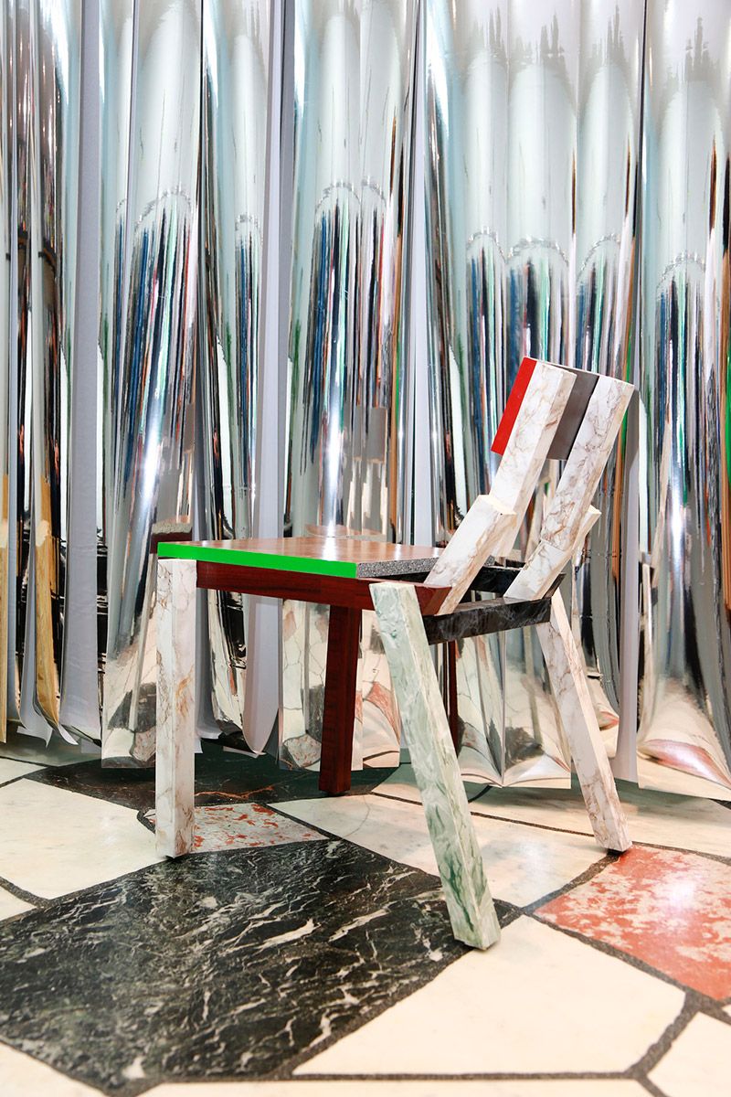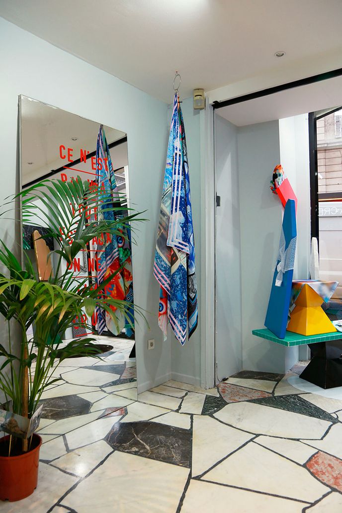 The space has been decorated by several young designers, including Victoria Wilmotte, who created its 80s-style shiny changing rooms, Clémence Seilles, who designed its concrete marble cubes and neo-Memphis chair, and Maroussia Rebecq, founder of the collective, who designed its African ottoman chairs.