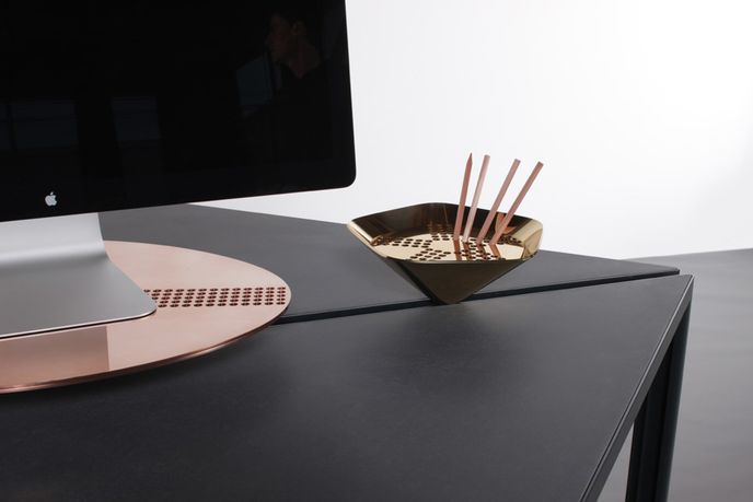 The use of darkened concrete with gilded, metallic bowls fits with our Industrial Futurism design direction, in which designers are inspired by dystopian futures.