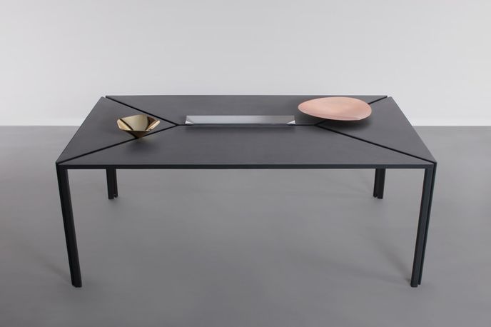 The table top comprises four angular concrete slabs that come together to form a channel that runs from each leg. As well as hiding cables, the channel also locks bowls and plates in place so that they appear to float on the surface.