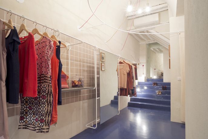 The locker-room look extends to display units as clothing, mirrors and accessories hang from white bent metal rails redolent of those found in sports clubs from the middle of last century. Such lean, linear references are a signature of the Genoese design studio, which is named after the abbreviation for an economic planning committee of the former Soviet Union.