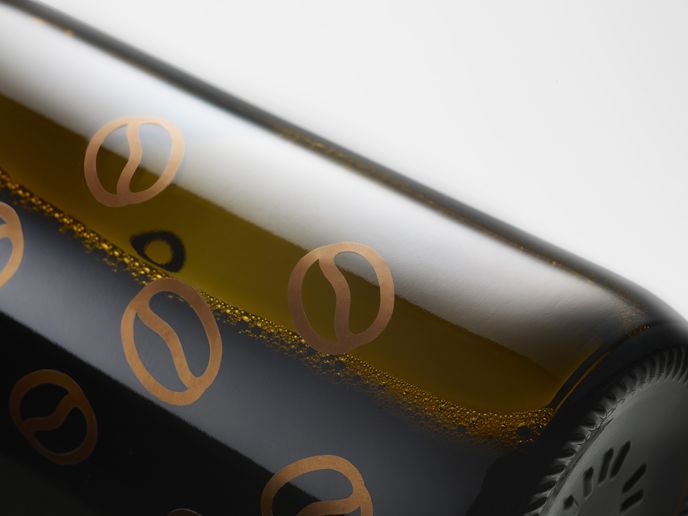 Existing bottles were recycled for the project, while the coffee bean labels were applied by hand, giving each object a unique pattern.