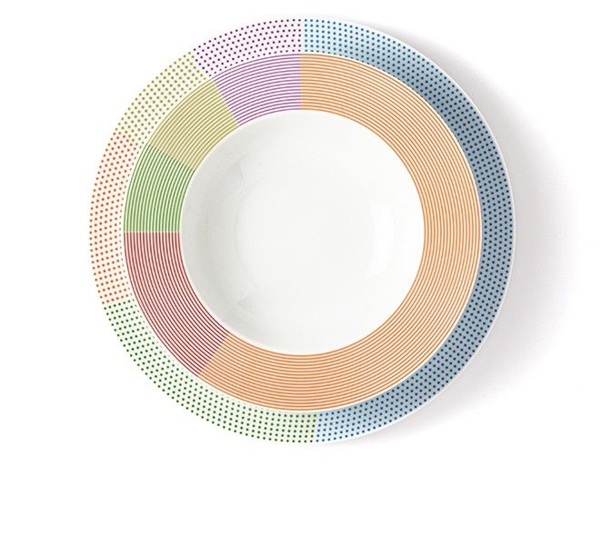 The bone china collection is decorated with a pattern in colours that represent the proportions and types of food in the Mediterranean diet, which is said to be beneficial for the heart. The vibrant colours on the rim of the dishes correspond to carbohydrates, fruit and vegetables, protein and dairy foods. Wine, tomatoes and olive oil also all have their own colours.
