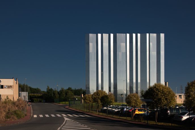 Designed by ACXT architects for electricity firm Arteche, the building houses equipment to test dielectric transformers. The outside is made from corrugated polished metal that reflects the light, creating different impressions from all angles.
