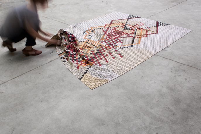 Berlin – German designer Elisa Strozyk’s Colored Wooden Rugs do more than the name suggests. They are indeed wooden rugs coloured in geometric patterns reminiscent of Aztec prints. But they are also DIY sculptures, personalised works of art that can be folded to fit the owner’s taste and living space.