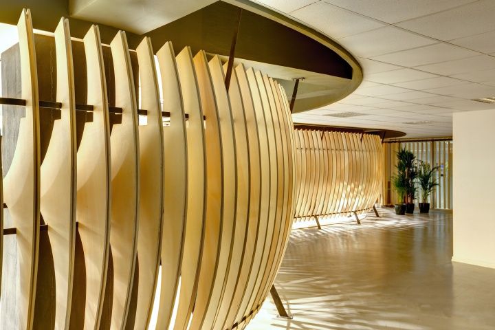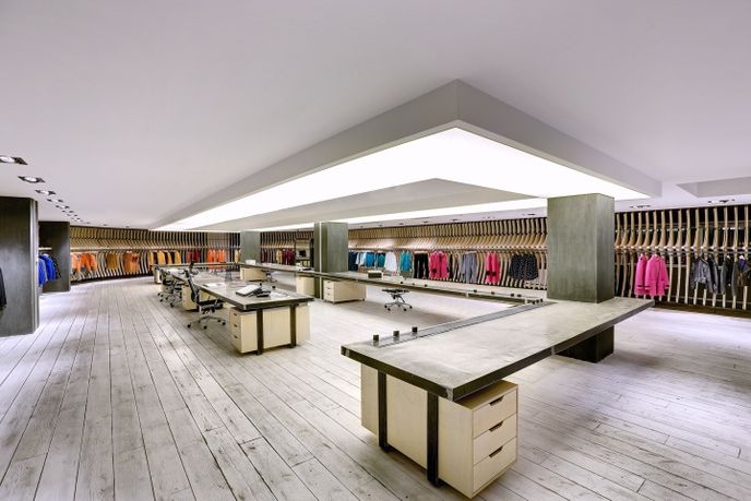 The architects chose to create an enclosure that blended the clothing racks seamlessly into the walls, with office desks in the middle. The wooden structure is a clean, simplistic use of the material that is both modern and craft-like in its aesthetic.