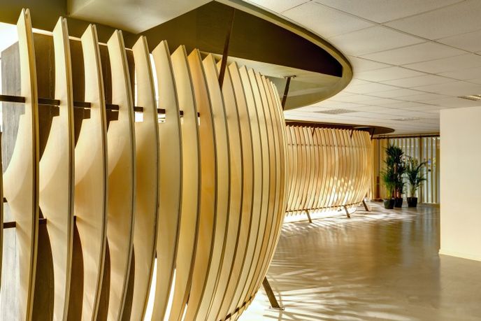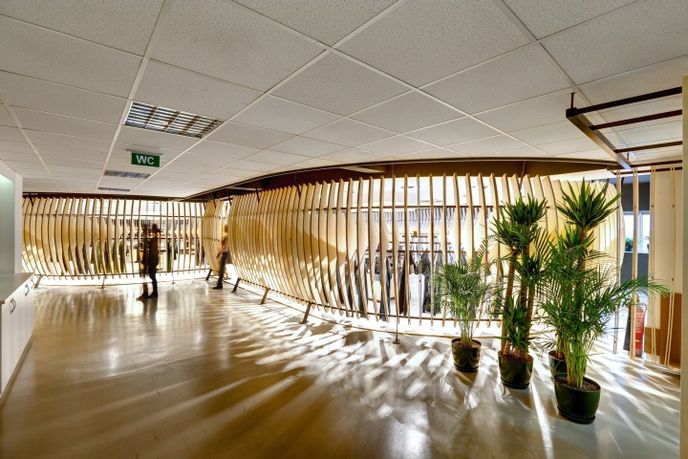 The shell has both a showcase and a separation element. In a statement, the architects said they had created ‘a perception of non-belonging in the space, to highlight the difference between existing function and the new [office]’.
