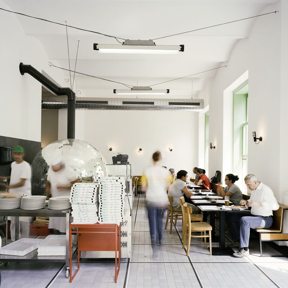 Wood-burning ovens are often the focal point of pizza places, but at Disco Volante, the spinning disco ball oven is both a centrepiece and enhances the ambiance. During the evening, the restaurant lights are dimmed and multicoloured spotlights are turned on the multifaceted oven to create a disco of light across the white walls and ceiling. Elsewhere, architect Lukas Galehr used a light touch to reference Italy, with subtle flashes of the country’s flag and the high ceilings found in canteens in Naples.