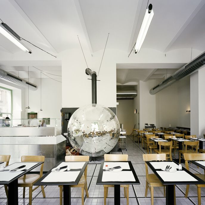 While the rest of the restaurant’s interiors are minimalist, the bold use of a disco ball is a fine example of how an injection of Neo Kitsch can add fun and interest to a space.