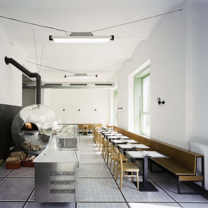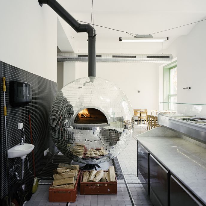 Vienna – Design studio Madame Mohr’s brief for the interiors of Austrian pizza restaurant Disco Volante was to create a space that evoked both a southern Napoli pizzeria and the Italian disco era of the 70s and 80s. The result is a classic pizzeria with a rotating giant disco ball oven.