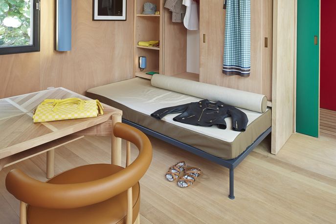 The four-room home – a one-off that will be auctioned by Sotheby’s – is furnished with clean, faithfully recreated natural wooden pieces, flexible elements such as a retractable canvas roofed courtyard, and accessorised by coral and sculptural pieces. Clothing and accessories from Louis Vuitton’s spring/summer 2014 Icons collection – inspired by Perriand – are strategically placed throughout.