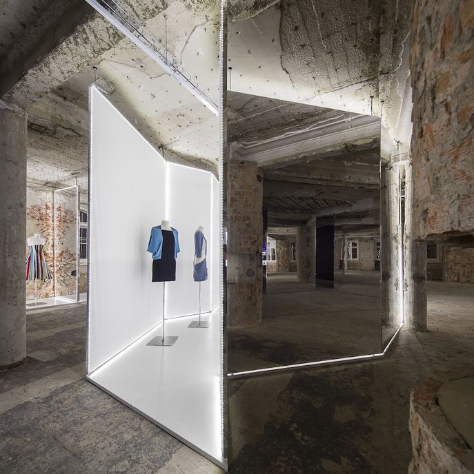 The exhibition’s space has been designed by Bureau Betak and allows visitors to view Baptista’s work from a variety of angles, using mirrors to reflect and refract the displays. The space echoes Baptista’s graphic and structured aesthetic, and the concrete, lighting and mirrors combine to create a grown-up funhouse, full of surprise and curiosity.
