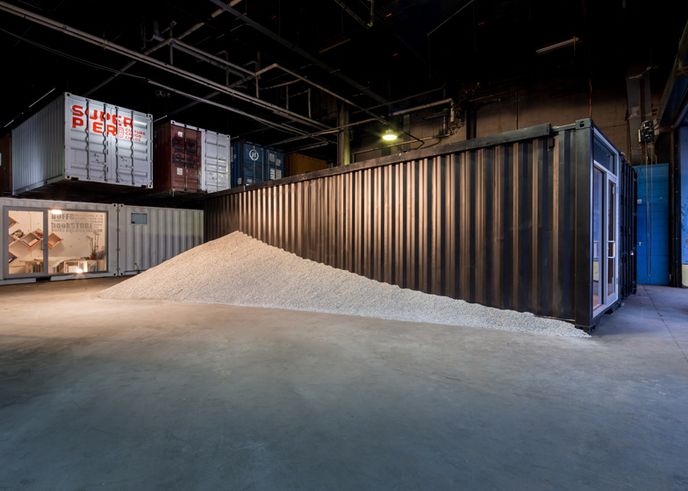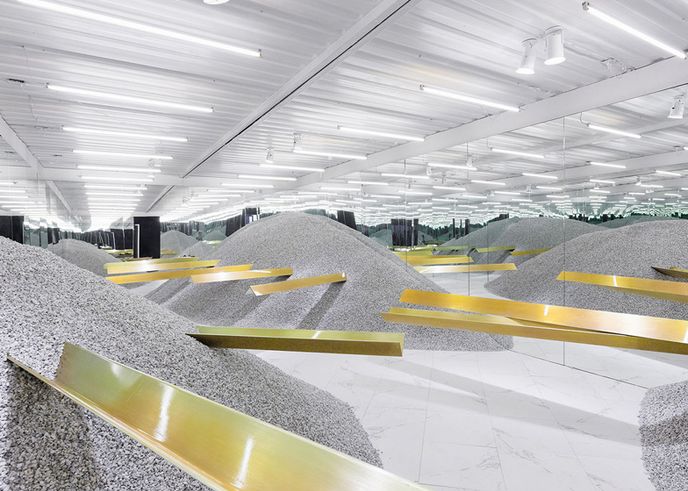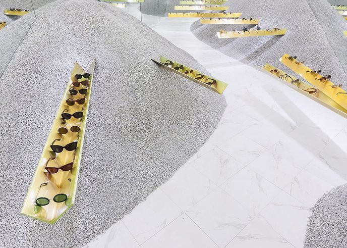 The shop, created by multi-disciplinary design practice Neiheiser & Valle, is set in a shipping container filled with piles of gravel chips, into which a series of golden beams have been embedded. Farrow’s eyewear is displayed in rows along the length of the beams. The gravel is piled against mirrored walls to create the illusion of infinite space.