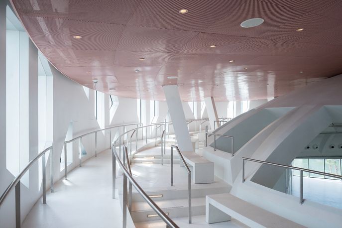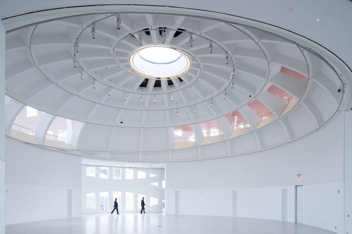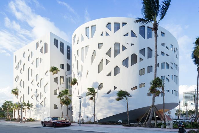 Its smooth concrete façade is punctuated with a mosaic of irregular-shaped windows. The Collins Avenue entrance of the circular building features a 46-feet cantilever in the form of a wedge cut out from the bottom of the structure. From the street level, visitors are invited to walk up a curved staircase into the lobby amphitheatre with pink marble-tiled floors. Guests can continue up to the second-floor theatre space, which features a domed ceiling, a central oculus and a full height window overlooking the adjacent street.