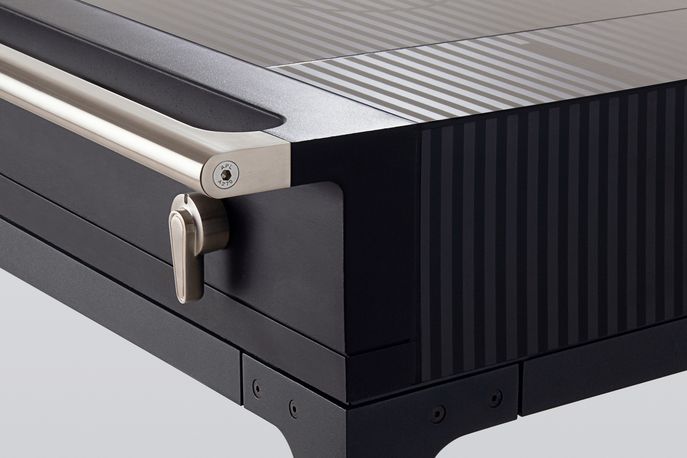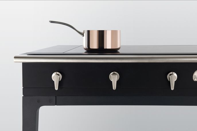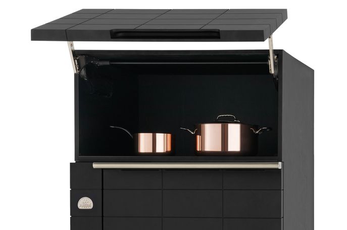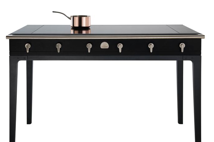 The Big Vaulted Oven Tower comprises an electric oven that sits between a storage cupboard above and a deep drawer below. When all the elements are closed, it resembles a classic wooden cabinet. Similarly, while the Induction Table looks like a traditional dining table, its surface conceals four heat conductors and it is, in fact, a stove.