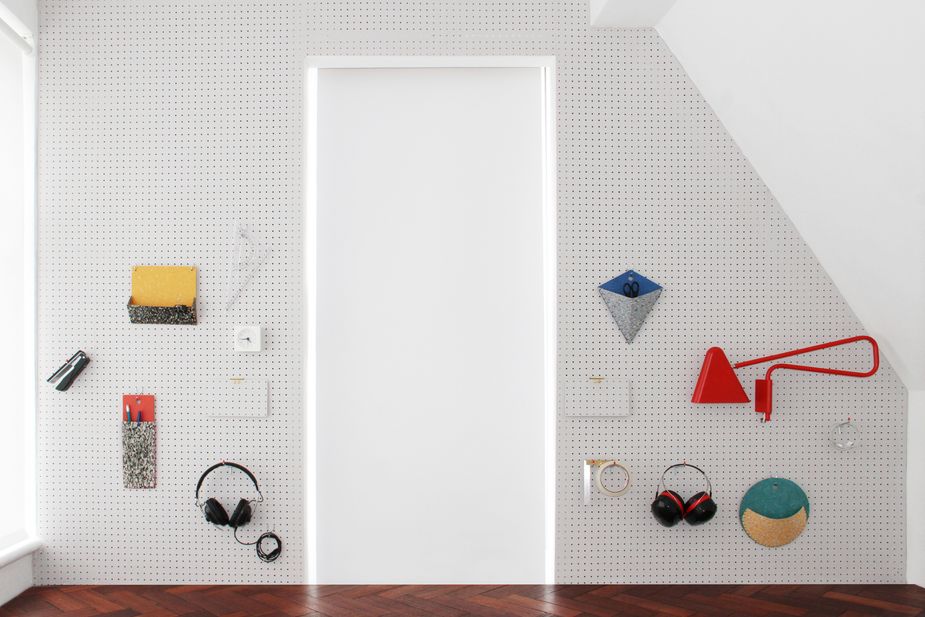 London – Cross-disciplinary design practice Studio Swine has created an office interior for Soho-based film production company EMU Films that uses space economically, with desks that fold out and pegboard walls.