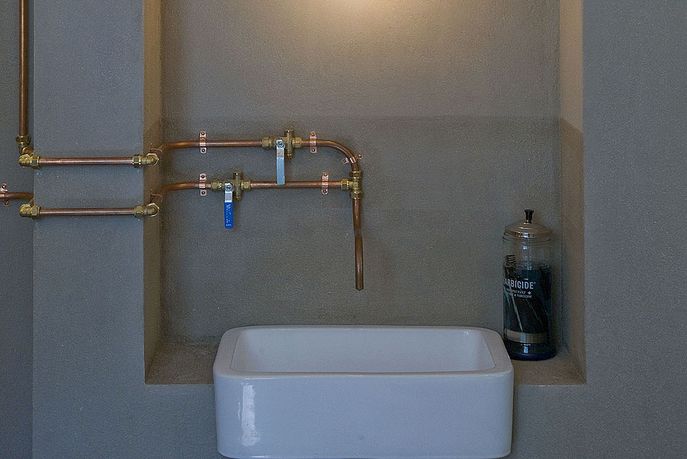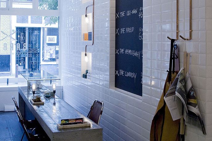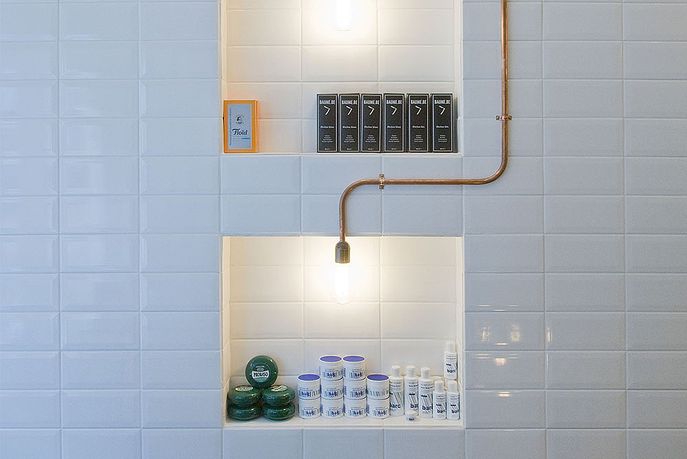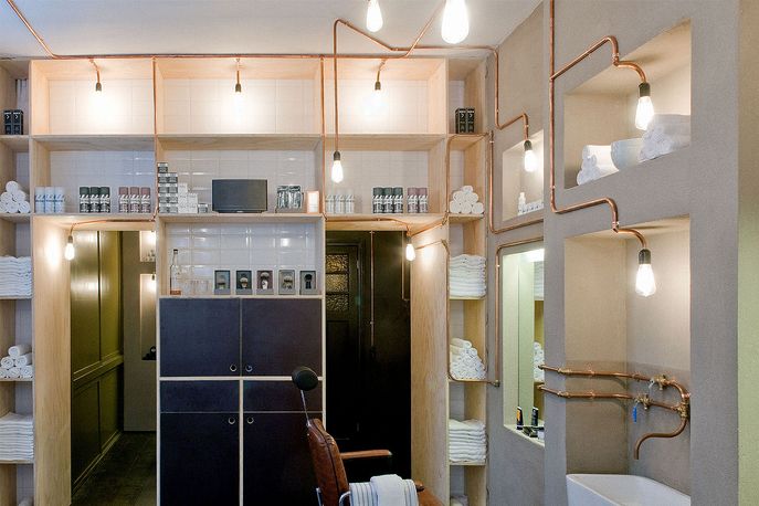 A series of copper tubes, which Hoksbergen compares to ‘a giant cobweb’, cover the water and electricity pipes at Barber. White tiled walls and leather shaving chairs contribute to an environment that is clinical and convivial. White towels, raw wood and even the 19th-century store front, all contribute to this aesthetic.