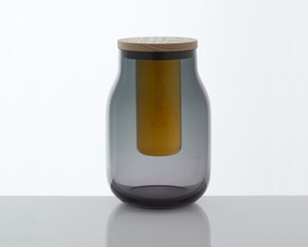 The revivalist inspiration for the project resulted in unusual combinations of materials. One vessel has a concrete weight on top, a reference to a method of sealing jars with heavy stones. Other jars are sealed with brass wire or a glass cylinder, while cork is used for decorative purposes.