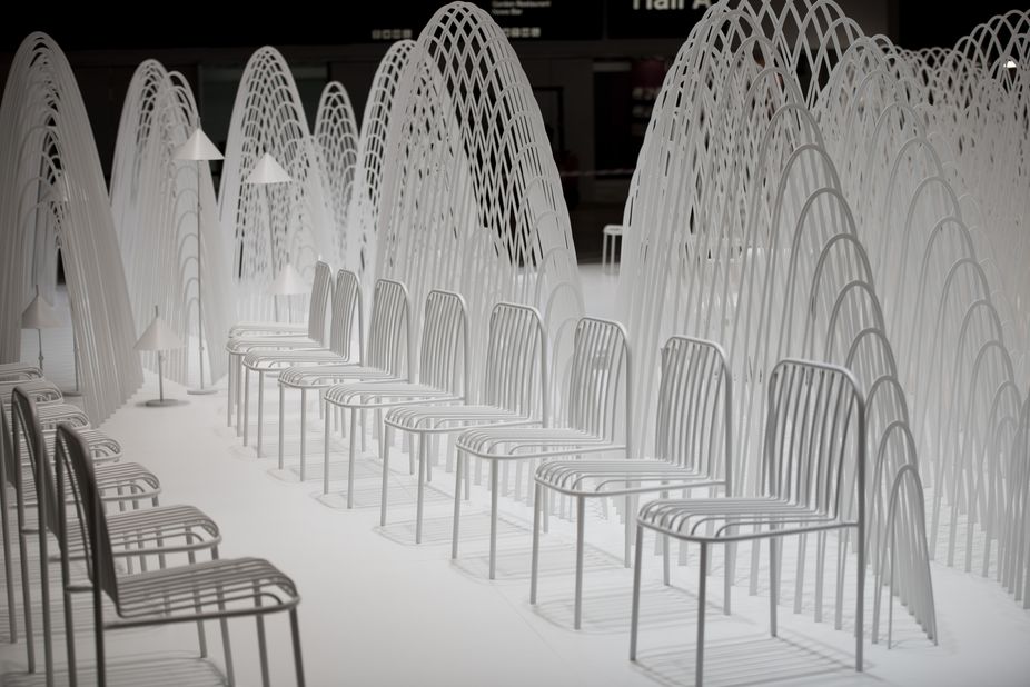 Stockholm – Oki Sato, chief designer and founder of Nendo, created a landscape of snow-capped peaks for his lounge at the entrance to the Stockholm Furniture and Light Fair.