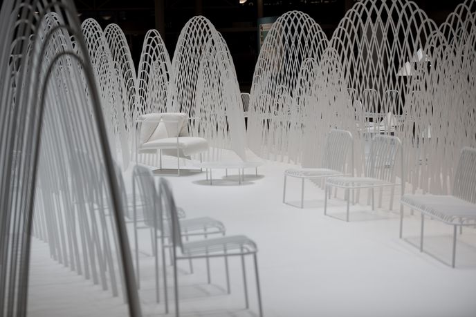 Created from Forex, a plastic foam material, 80 5mm boards were cut and stretched out, creating evenly spaced partitions and peaks in a variety of sizes to emulate a snowy mountain environment. Pieces of furniture were then placed between the partitions, encouraging visitors to interact with the work and escape from the busy show.