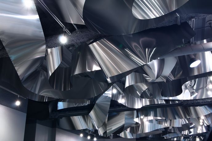 The ceiling, which is made out of recycled aluminium, is a large sculpture featuring curves and bends to represent the ebb and flow of water. Moreover, the fluid shape of the metal allows for ever-changing light, much like the reflection of light on shimmering water.