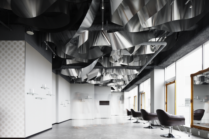 With silver-painted walls, floor-to-ceiling windows and the light-shifting aluminium ceiling, the Arkhe salon is reminiscent of our Industrial Futurism design direction, in which designers create other-worldly designs with industrial materials.