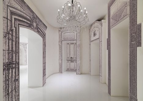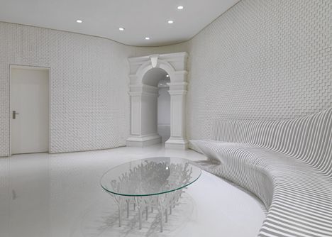 The interiors are all white with a hint of grey, with a juxtaposition of 2D and 3D features and a mix of textures to create an architecturally complex monochromatic space.